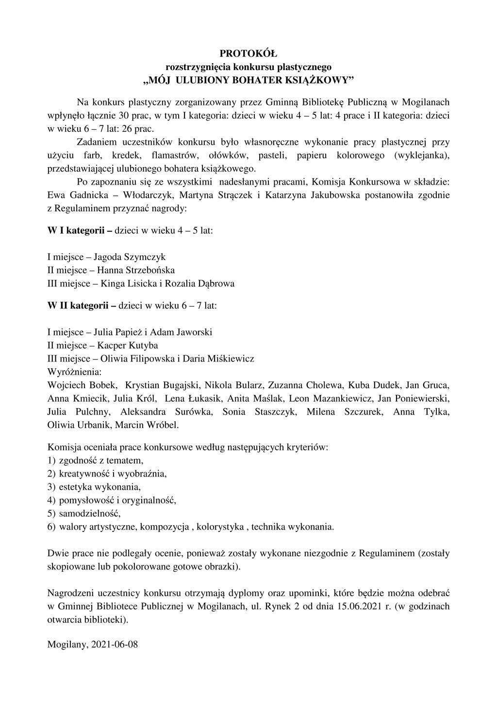 PROTOKÓŁAktualnościPROTOKÓŁOpublikowano w dniu: 10.06.2021<>Protokół rozstrzygnięcia konkursu plastycznego ,,Mój ulubiony bohater książkowy''.udostępnij na