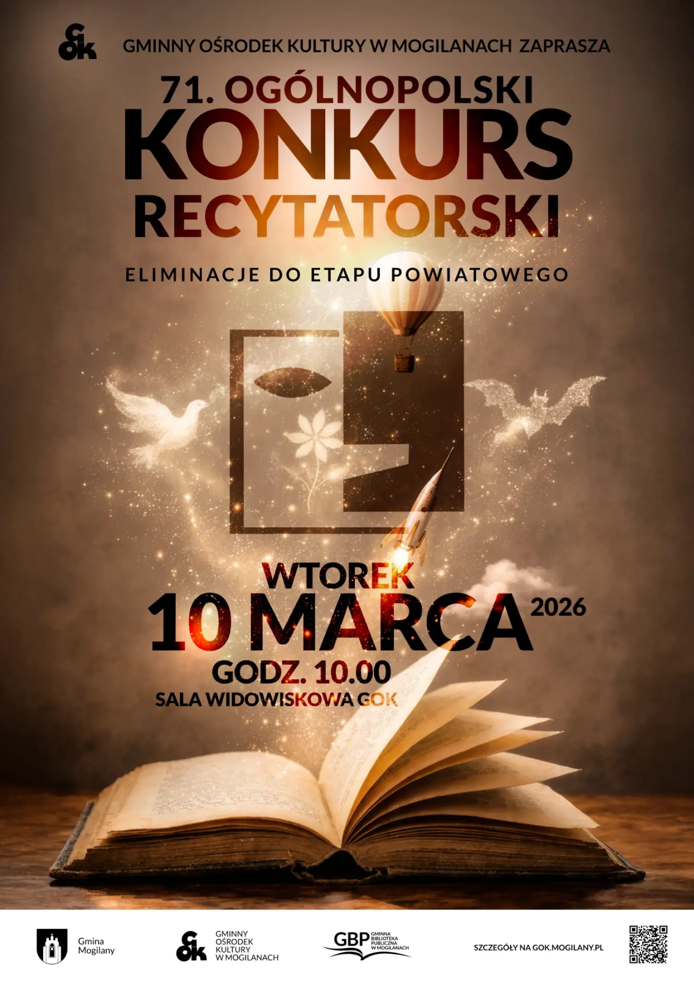 Gminny Ośrodek Kultury w Mogilanach zaprasza dzieci, młodzież i dorosłych do udziału w Gminnym Konkursie Recytatorskim, będącym eliminacjami do etapu powiatowego 71. Ogólnopolskiego Konkursu Recytatorskiego.