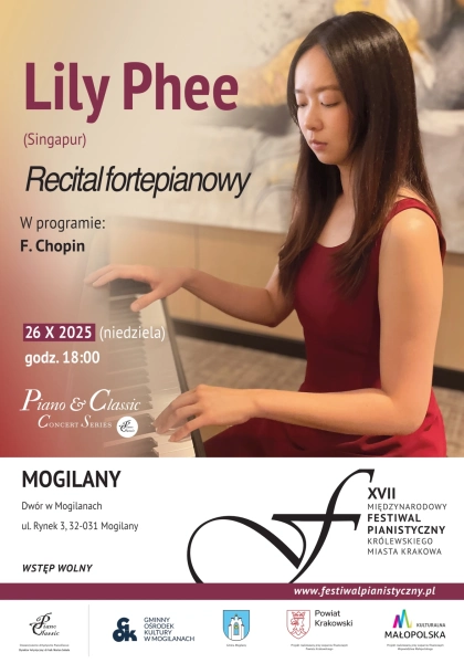 Singapurska pianistka Lily Phee rozpoczęła swoją muzyczną przygodę w wieku 5 lat. Naukę kontynuowała w Akademii Sztuk Pięknych Nanyang w Singapurze pod kierunkiem prof. Reny Phua, a następnie rozpoczęła naukę w Akademii Mu- zycznej Krzysztofa Pendereckiego w Krakowie, gdzie ukończyła z wyróżnieniem studia magisterskie w Klasie prof. Andrzeja Pikula. Obecnie jest słuchaczką stu- diów podyplomowych. Zdobyła wyróżnienie na II Międzynarodowym Konkursie Muzycznym im. Karola Szymanowskiego oraz zadebiutowała z Orkiestrą Filharmonii Częstochowskiej wykonując Koncert G-dur M. Ravela jako laureatka konkursu „Gram z Orkiestrą” organizowanym przez Akademię Muzyczną Krzysztofa Pendereckiego w Krakowie. Jest także laureatką II nagrody na Międzynarodowym Konkursie Piani- stycznym im. Fausta Zadry we Włoszech, a w ubiegłym roku otrzymała nagrodę Oscara Macchioniego za najlepszą interpretację dzieła Karola Szymanowskiego ( II Sonata op.21 ). Do godnych uwagi nagród zdobytych w jej rodzinnym kraju należą pierwsze nagrody na Międzynarodowym Konkursie Pianistycznym dla Młodzieży w Sin- gapurze, Międzynarodowym Konkursie Pianistów Klasycznych w Singapurze, trzecie nagrody na Krajowym Konkursie Pianistów i Skrzypcowych oraz na Kon- kursie Pianistycznym Cristofori. Dodatkowo w 2018 roku została uhonorowana tytułem „Yamaha Artist” w ramach inicjatywy „I Play Yamaha”. Koncertowała w Polsce, Danii, Rosji, Hongkongu i Tajlandii, gdzie występowała z recitalami i brała udział w konkursach. Do jej znaczących osiągnięć konkurso- wych zaliczają się pierwsze nagrody na Letnim Festiwalu Muzycznym Isaaca Albéniza w Camprodon w Hiszpanii oraz międzynarodowy konkurs pianistyczny Recondite Armonie III w Grosseto we Włoszech. Brała także udział w kursach mistrzowskich prowadzonych przez wybitnych pianistów, takich jak Tamás Ungár, Robert Winter, Kenneth Hamilton i Dina Parakhina.