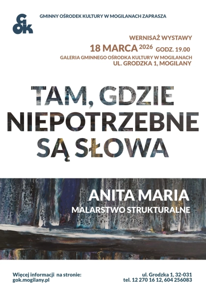 Zapraszamy o godzinie 19.00 do Galerii Gminnego Ośrodka Kultury w Mogilanach, przy ul. Grodzkiej 1. Wystawa nosi tytuł „Tam, gdzie niepotrzebne są słowa”, można będzie na niej zobaczyć obrazy akrylowe dużych rozmiarów, o bardzo bogatej kolorystyce i trójwymiarowej strukturze.